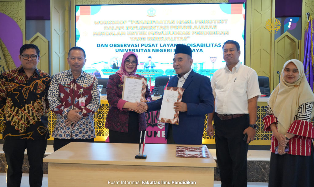 fip.unesa.ac.id, SURABAYA—Fakultas Ilmu Pendidikan (FIP) Universitas Negeri Surabaya (UNESA) menerima kunjungan dari SMP Negeri 1 Wonoayu dalam rangka penandatanganan Memorandum of Understanding (MoU) dan pelaksanaan workshop bertajuk “Pemanfaatan Hasil Psikotest dalam Implementasi Pembelajaran Mendalam untuk Mewujudkan Pendidikan yang Berkualitas” pada Selasa, 23 September 2025, di Auditorium Gedung O1 lantai 2, FIP UNESA.