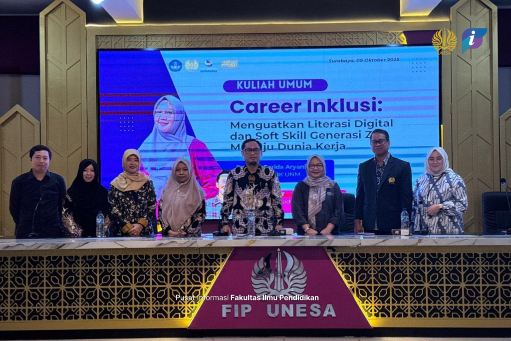 fip.unesa.ac.id, SURABAYA—Program Studi Bimbingan dan Konseling (BK) Fakultas Ilmu Pendidikan Universitas Negeri Surabaya (FIP UNESA) menyelenggarakan kuliah tamu bertajuk “Career Inklusi: Menguatkan Literasi Digital dan Soft Skill Generasi Z Menuju Dunia Kerja,” pada Kamis, 9 Oktober 2025 di Ruang Auditorium O1 lt. 2, FIP UNESA.