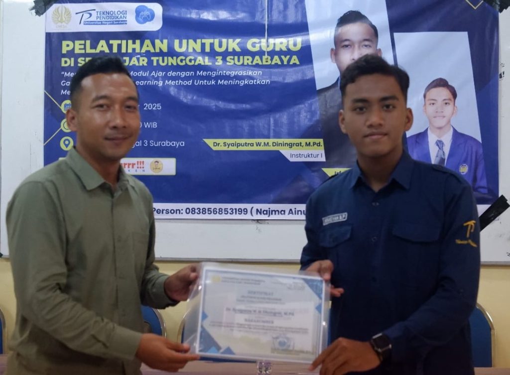 fip.unesa.ac.id, SURABAYA- Mahasiswa Program Studi Teknologi Pendidikan, Fakultas Ilmu Pendidikan (FIP) Universitas Negeri Surabaya (UNESA) menyelenggarakan Pelatihan Pengembangan Modul Ajar Berbasis Game-Based Learning method bagi para guru di SDN Jajar Tunggal 3 Surabaya pada 15–16 Desember 2025. Kegiatan ini merupakan bagian dari upaya mahasiswa untuk berkontribusi secara nyata dalam peningkatan kualitas pembelajaran di sekolah dasar melalui penerapan inovasi pendidikan berbasis teknologi dan pedagogi. Selain menjadi luaran mata kuliah pengelolaan pelatihan, kegiatan yang berupa pelatihan tersebut bertujuan untuk membekali guru dengan pemahaman dan keterampilan dalam merancang modul ajar yang interaktif, kreatif, serta berorientasi pada penguatan kemampuan metakognitif siswa. Adapun mahasiswa yang berpartisipasi dalam pelatihan tersebut yakni: