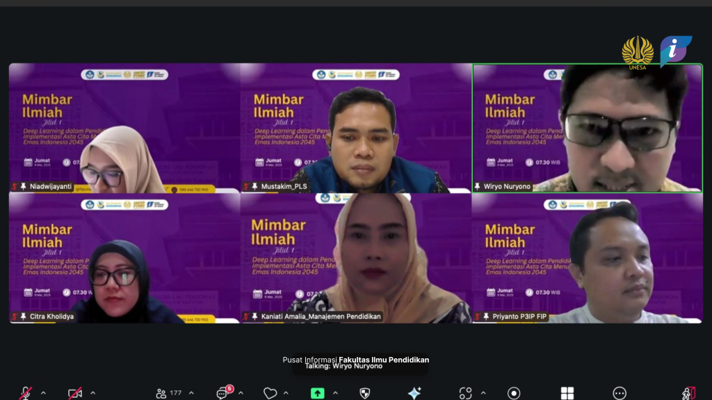 fip.unesa.ac.id, SURABAYA—Fakultas Ilmu Pendidikan (FIP) Universitas Negeri Surabaya (UNESA) menyelenggarakan Mimbar Ilmiah Jilid 1 bertajuk “Deep Learning dalam Pendidikan: Implementasi Asta Cita Menuju Generasi Emas Indonesia 2045” secara daring melalui Zoom pada Jumat, 9 Mei 2025.