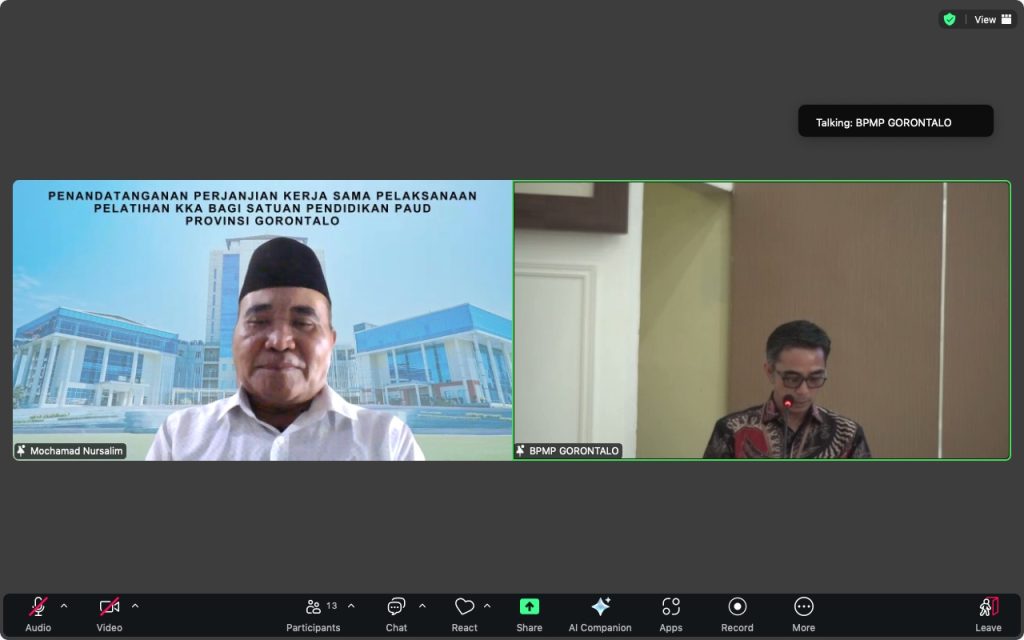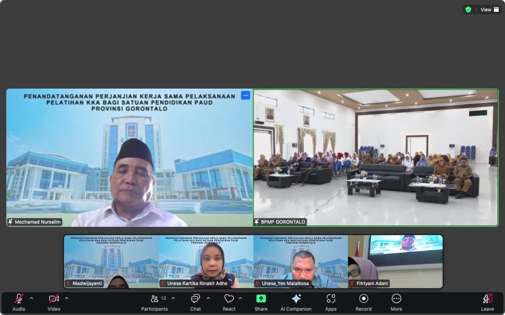 fip.unesa.ac.id, SURABAYA – Program Studi Pendidikan Guru Anak Usia Dini (PG-PAUD) Fakultas Ilmu Pendidikan (FIP) Universitas Negeri Surabaya (UNESA) menjalin kerja sama dengan Balai Penjaminan Mutu Pendidikan (BPMP) Provinsi Gorontalo dalam penyelenggaraan Pelatihan Koding dan Kecerdasan Artifisial (KKA) bagi satuan pendidikan PAUD. Kesepakatan tersebut dituangkan dalam Penandatanganan Perjanjian Kerja Sama (PKS) yang digelar secara daring melalui Zoom pada Selasa, 12 Agustus 2025.