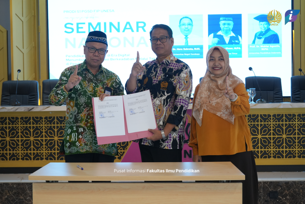 fip.unesa.ac.id, SURABAYA—Sebagai upaya memperkuat nilai-nilai kemanusiaan di tengah derasnya arus digitalisasi, Program Studi Pendidikan Guru Sekolah Dasar (PGSD) Fakultas Ilmu Pendidikan Universitas Negeri Surabaya (FIP UNESA) menggelar Seminar Nasional pada Kamis, 15 Mei 2025 di Gedung O1 Kampus Lidah Wetan.