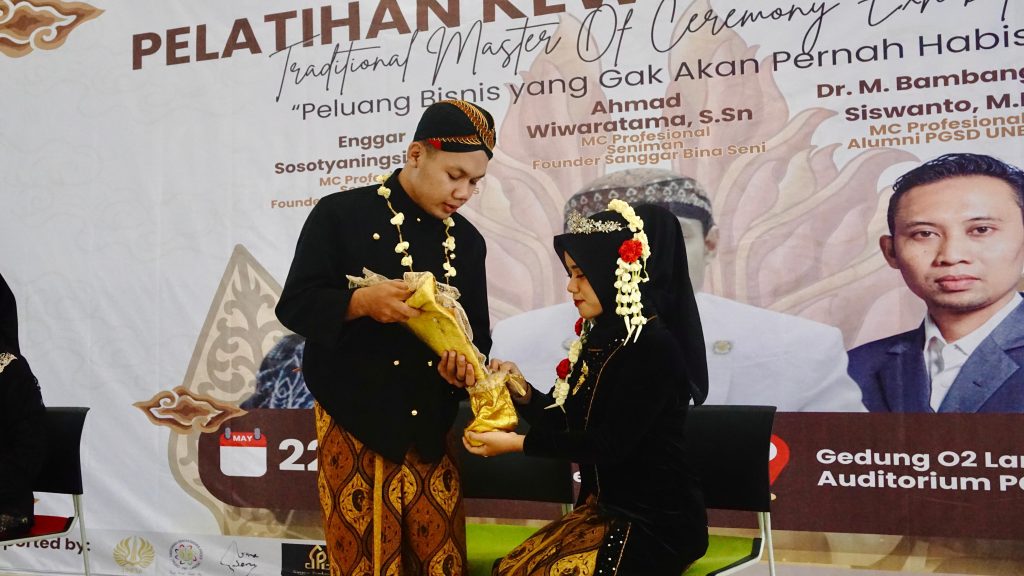 Selain itu, terdapat sesi praktik prosesi adat “Panggih Temanten” yang ditampilkan oleh perwakilan mahasiswa angkatan 2023 menjadi daya tarik tersendiri. Prosesi yang dibawakan dengan khidmat dan estetis ini memperlihatkan bahwa pewara tradisional bukan sekadar pelestari budaya, melainkan juga profesi profesional yang dapat dikembangkan secara serius.