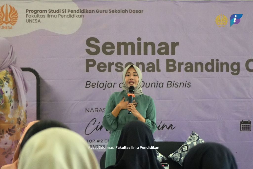 Seminar dipandu oleh dosen PGSD, Zaenal Abidin, S.Pd., M.Pd., sebagai moderator. Dalam pemaparannya, Cindy menjelaskan bahwa personal branding merupakan kondisi nyata yang dibangun untuk memperkenalkan diri kepada masyarakat. Berbeda dengan pencitraan, personal branding bersifat autentik karena sesuai dengan nilai dan jati diri seseorang.
