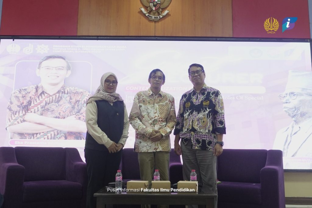 fip.unesa.ac.id, SURABAYA— Program Studi S1 Pendidikan Luar Biasa (PLB) Fakultas Ilmu Pendidikan (FIP) Universitas Negeri Surabaya (UNESA) menggelar kuliah tamu bertema “Contextualization of Disability Inclusion: Improving the Future Mindset and Roles of the Special Education Teachers in Indonesia”. Kuliah tamu ini menghadirkan Eka Prastama Widiyanta, M.Pd, selaku Komisioner Komisi Nasional Disabilitas (KND) sebagai narasumber utama. Kegiatan ini berlangsung pada Kamis, 13 November 2025, pukul 14.00-16.00 WIB di auditorium lantai 4 gedung O6 FIP UNESA.